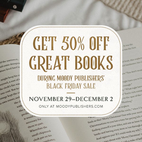 From Black Friday, November 29th, through Cyber Monday, December 2nd, every single book at Moody Publishers will be 50% off—including my book,