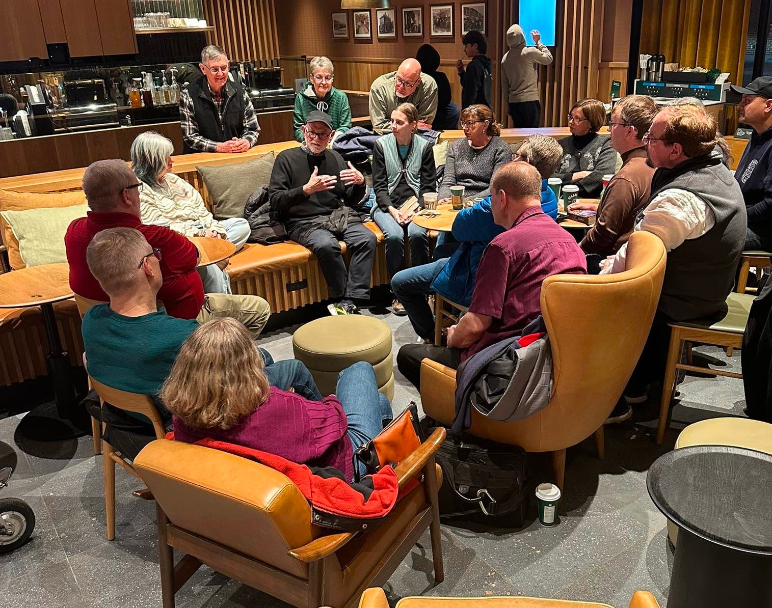 On a very cold evening, Christine and I attended Stephen R. Lawhead’s gathering with readers at the downtown Starbucks in Wheaton last night (we’re in the lower left corner of the photo). I was looking for a little info and inspiration for my own fantasy writing and got both.